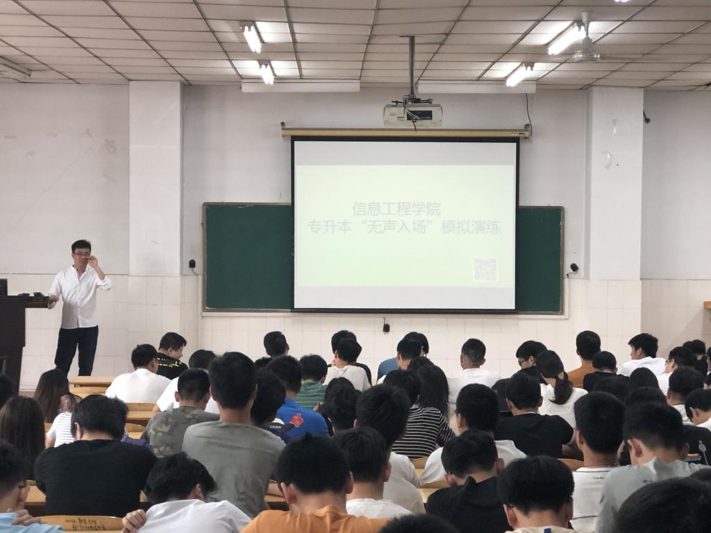 我院专门成立了专升本诚信教育领导小组,负责督促检查专升本诚信教育以及“无声入场”活动开展情况。“无声入场”工作由我院就业专员郭睿老师和辅导员薛宾田老师组织开展,在演练开始之前,薛老师向在场考生传达了专升本考试中的注意事项,详细解读了“无声入场”考试的相关政策;对考试当天不允许携带无关的物品,穿着衣服不能含有金属成分等注意事项进行全面讲解,并提醒体内植入金属的考生要及时按要求办理无声入场证明。