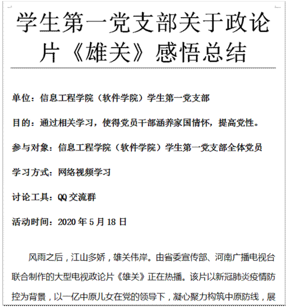 为深入学习宣传贯彻习近平总书记关于统筹推进疫情防控和经济社会发展工作的重要论述,根据学校《关于认真做好大型电视政论片《雄关》学习宣传工作的通知》要求,williamhill威廉希尔(软件学院)党委高度重视,学院六个教工党支部和四个学生党支部积极组织师生于5月11日至5月16日学习观看了由省委宣传部、河南广播电视台联合制作的六集电视政论片《雄关》。