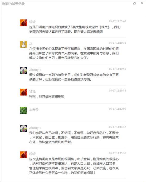 《雄关》政论片的观看与学习,在学院师生们中引起了热烈地反响,学院各党支部于16日~17日利用信息技术召开了线上学习研讨会。大家结合自身实际,或通过微信聊天写心得,或通过视频会议谈感受。纷纷表示,该政论片展示了中国战“疫”的河南力量,激昂处热血沸腾,感人处催人泪下。通过交流,大家更深刻认识到了中国共产党领导和我国社会主义制度、国家治理体系强大生命力和显著优越性,更坚定了在平凡的工作岗位上用实际行动彰显责任与担当的勇气与信念。(李井竹/文 各党支部/图)