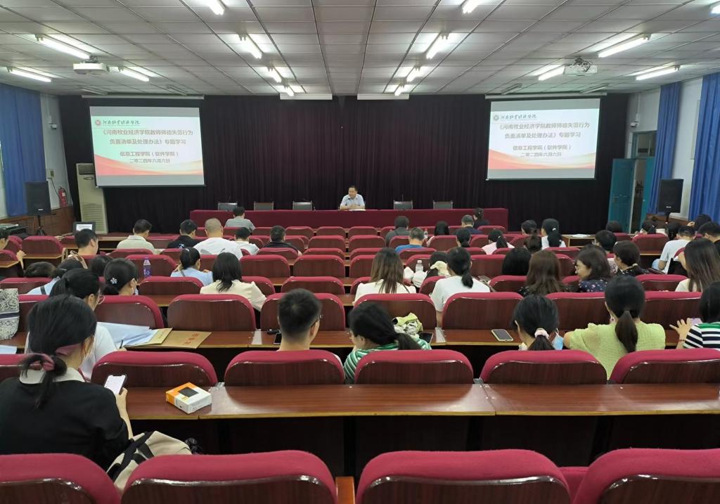 为深入推进师德师风建设,提升教师的师德修养,规范教师从教行为,6月6日下午,williamhill威廉希尔(软件学院)召开《williamhill中国教师师德失范行为负面清单及处理办法》集中学习会,会议由学院院长连卫民主持,全体教职工参加。