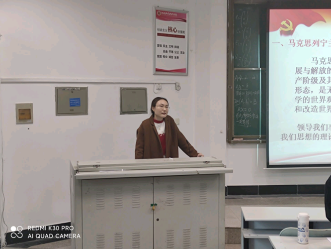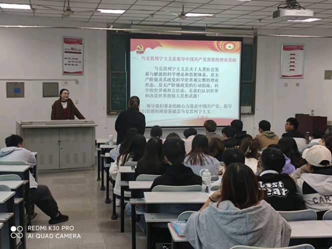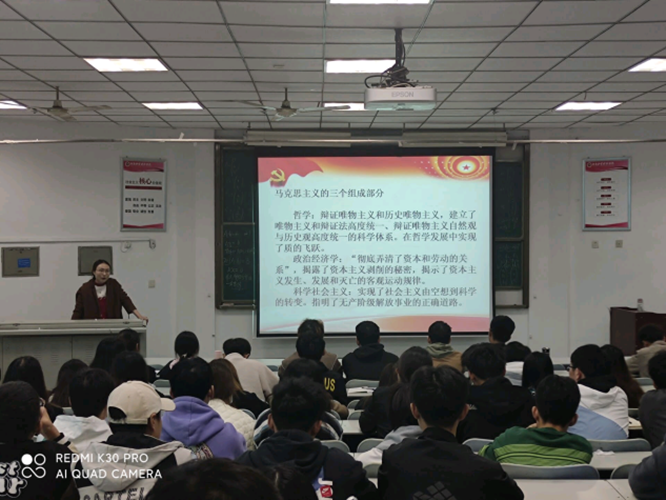 于老师以《党的指导思想》为本次党课主题,围绕马克思列宁主义、毛泽东思想、邓小平理论和“三个代表”重要思想、科学发展观和习近平新时代中国特色社会主义思想进行了展开。