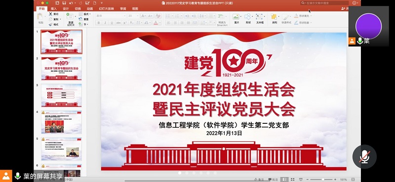 为深入学习贯彻党的十九届六中全会精神,进一步强化学生党员队伍政治理论建设,,根据学校党委做好2021年度基层党组织组织生活会和开展民主评议党员工作有关事项的通知要求,williamhill威廉希尔(软件学院)学生第二党支部于1月13日在腾讯会议召开了2021年度组织生活会暨民主评议党员大会,学生第二党支部全体党员参加,学生第二党支部书记叶子主持会议。