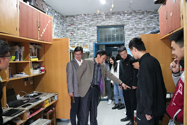 2021年4月24日下午,我院党委书记杨行昌、党委副书记蔡中民、团委书记郭睿以及全体辅导员于对学生宿舍状况进行了走访视察。