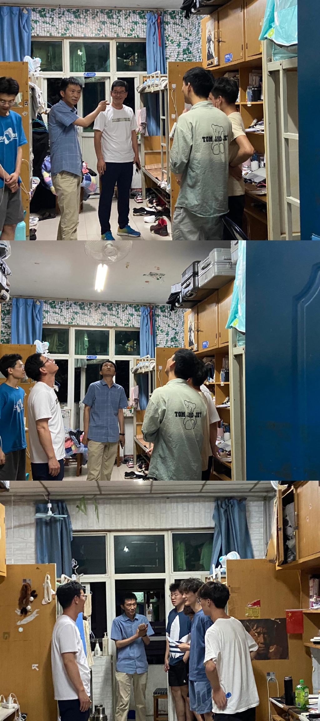 为深入了解我院学生在校的住宿条件和生活状况,进一步改善学生的生活和学习环境, 2021年6月7日晚8点,我院党委书记杨行昌、院长连卫民、党委副书记蔡中民、团委书记郭睿在辅导员老师的陪同下对学生宿舍进行了走访调研。