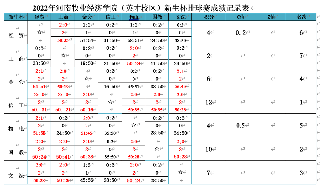 旭阳煦煦,秋风飒飒,为丰富同学们的课余文化生活,提高同学们的身体素质和团体合作能力,2022年11月8日下午,在我校精心组织下,在学校各部门的热心配合下,我校举行了新生杯排球赛。一声哨响之后,展开了精彩的比拼。各队队员各施绝技,发球、起跳、拦网、扣球,每一次精彩的传球与得分都引来欢呼阵阵,“加油、加油”的助威声铿锵有力,此起彼伏,队员们充分发挥出自己精湛的个人技术和熟练的战术配合。比赛场上,队员们个个精神抖擞,配合默契,气氛文明热烈,赢得了场边围观学生的阵阵喝彩。经过一周的激烈角逐。11月15日下午,比赛圆满落幕,经过多轮的对决,最后的名次学院依次为:信工队、国教队、文法队、金会队、物电队、经贸队、工商队。