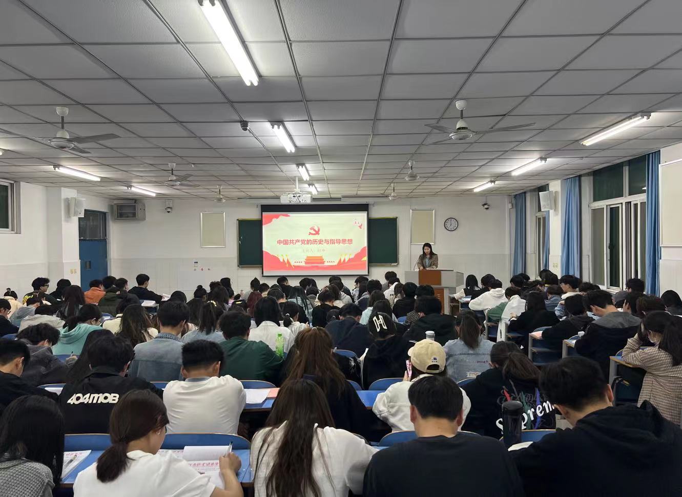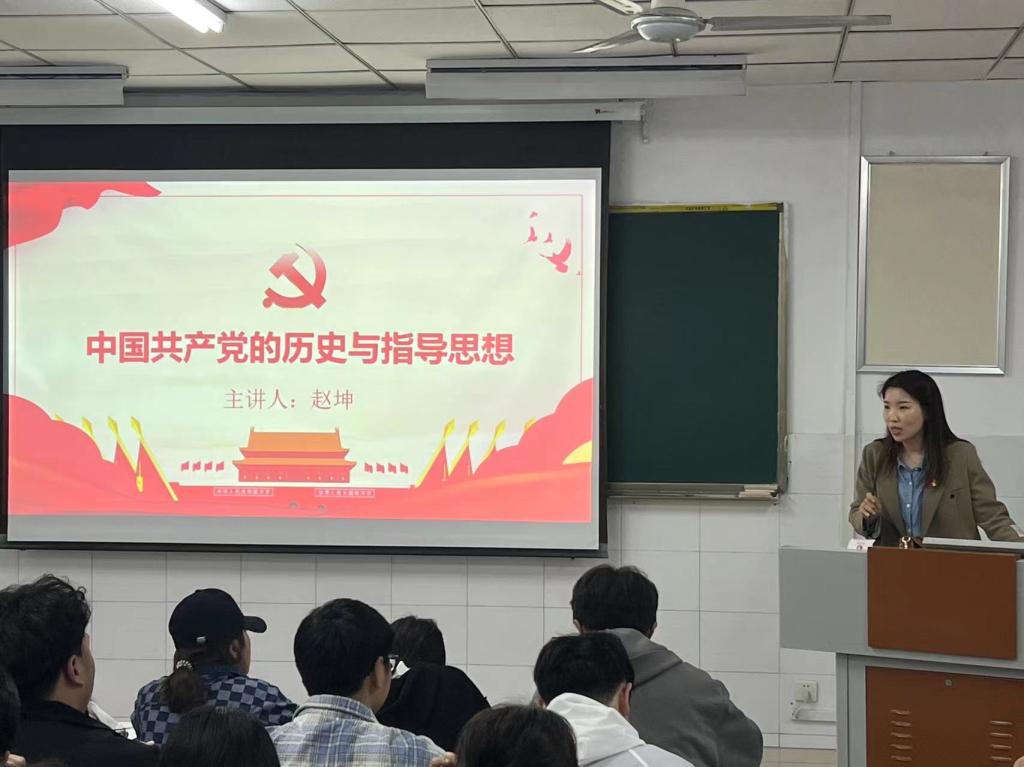 赵坤老师以中国共产党的历史开篇,分别从三个时期讲述了中国共产党的诞生及发展历程,说明了党史的学习意义,并指出:“中国共产党的历史本身就是一部具有丰富内容的教科书。党史中有很多成功的经验,以及经受挫折失败的教训,都是我们宝贵的财富。”同学们从历史中汲取智慧和力量,加强党的思想理论教育。在赵老师讲课的过程中同学们都在全神贯注的听讲,表情严肃认真。接着,赵坤老师从四个方面阐述了中国共产党的指导思想,解释道:“党的指导思想又称党的行动指南,是指导我们党全部活动的理论体系,是党的思想建设、组织建设、作风建设、党风廉政建设和制度建设的理论基础。”中国革命事业的成功以及社会主义现代化建设事业不断取得新的伟大成就,一个关键所在就是坚持党的指导思想。