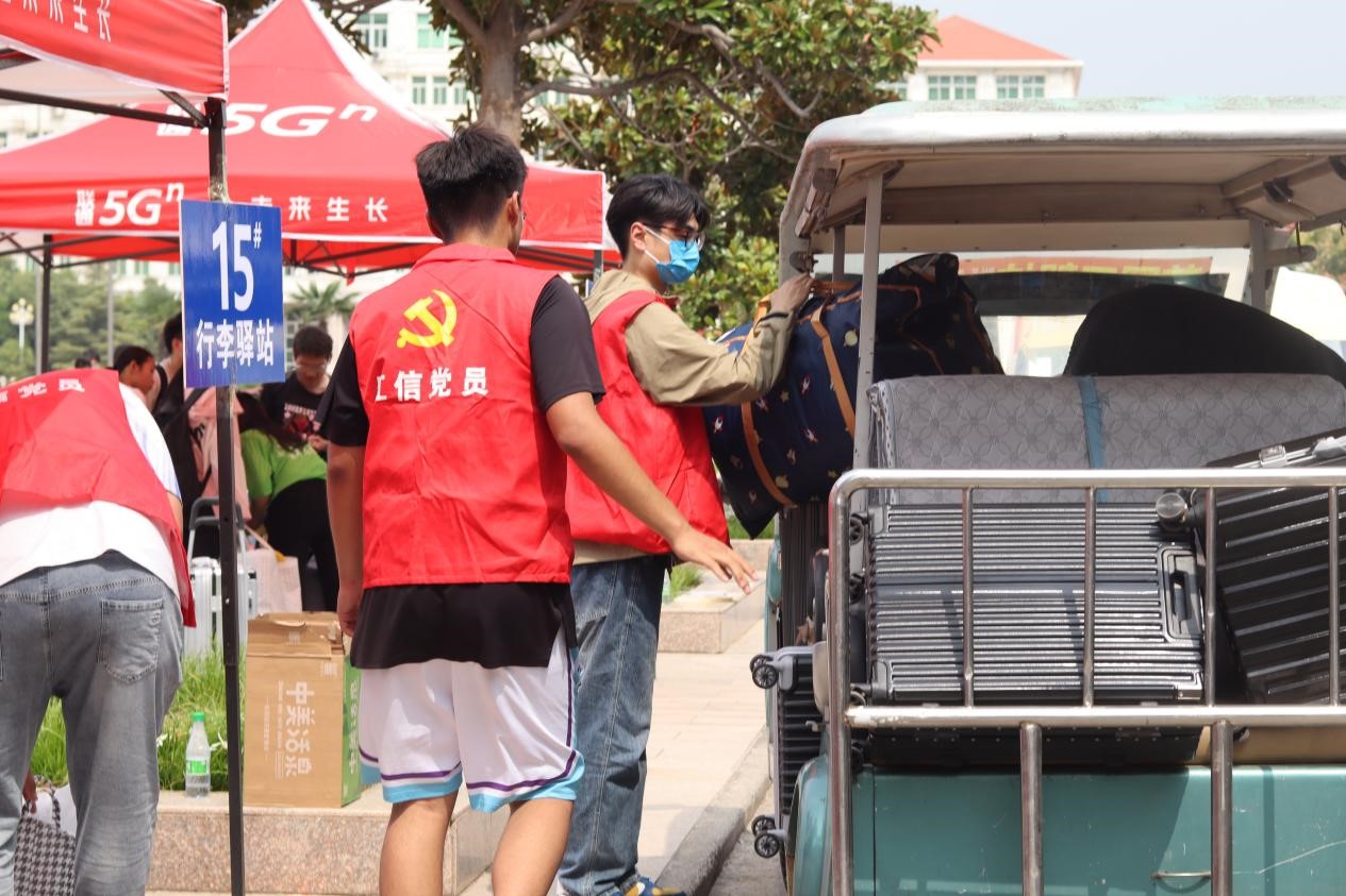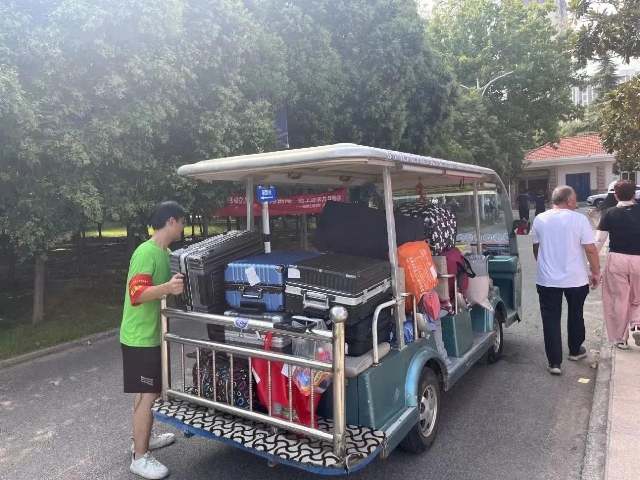 为减轻新生行李负担,学院设置了行李驿站,新生们可将行李寄存在驿站,志愿者负责贴好标签并进行看管,再由我院的“爱心车”送至各栋宿舍楼下,用实际行动帮助每一位新生更快更方便的搬运入学行李,使学生和家长们切实感受到学院的关心。