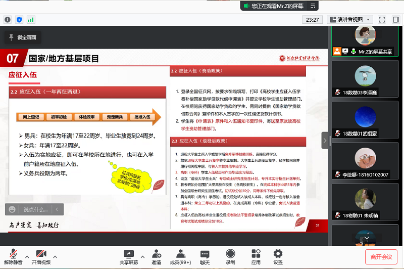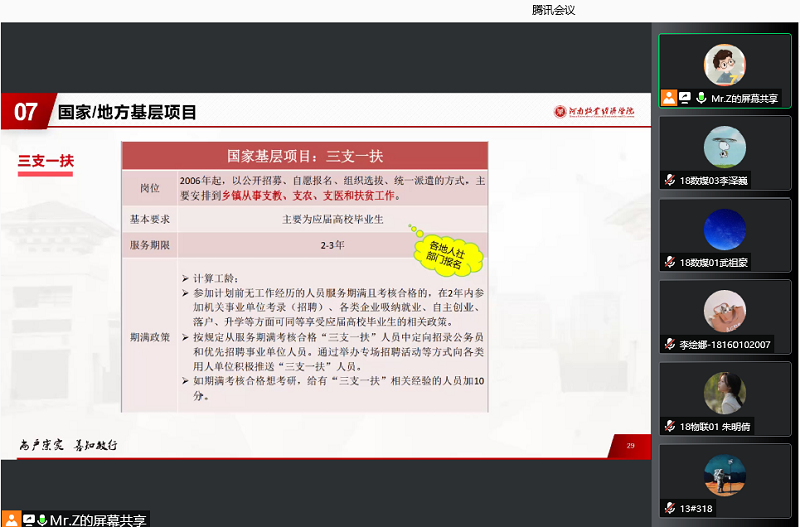 18级辅导员张紫烨老师在4月23日晚上召开了毕业生“走基层、促就业”线上专项主题班会,结合教育部发布的《关于做好2022届全国普通高校毕业生威廉希尔工作的通知》要求,针对“三支一扶”、“西部计划”、“特岗教师”、“大学生村官”、“参军入伍”、“直招士官”等中央基层就业项目的工作内容、报考流程和相关政策要求做了生动细致的宣传与讲解,并针对同学们的一些疑问进行在线解答。线下,张紫烨老师在办公室为部分对“西部计划”和“参军入伍”等基层项目感兴趣的同学进行答疑解惑,针对不同的同学提出了详细而具体的建议。