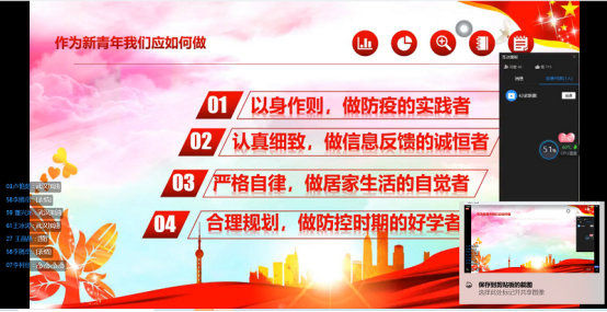 本次网络团课的顺利开展,不仅使同学们对疫情有了更科学、更理性的认识,坚定了不听谣、不信谣、不传谣的决心,提升了带头讲事实、明真相的责任感;而且使同学们更加深刻认识到,无论处于什么样的职位,无论从事什么样的行业,我们都有责任为祖国做出贡献。做好我们该做的,做好我们能做的,青春无畏敢于担当,让我们一起加油,为祖国尽一份力!(张梦银/文 图)
