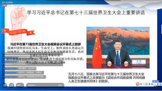 本次团课主要围绕学习习近平总书记在第七十三届世界卫生大会上的重要讲话内容而展开。团课伊始,团课主持人带领学生深入学习了习近平总书记在会上发表的《团结合作战胜疫情,共同构建人类卫生健康共同体》致辞,让同学们深刻认识到党始终把人民的生命安全和身体健康放在第一位,明确构建人类卫生健康共同体的重要性和中国青年的时代使命。疫情面前,任何国家都不能置身事外,我国在此次疫情防控工作取得的成效,再次彰显了中国共产党领导和中国特色社会主义制度的显著优势,每一位青年也应担负起时代赋予的重任。有学生表示作为新时代大学生应坚定制度自信,好好学习知识,练就过硬本领,主动担当起祖国和时代赋予的责任,在担当中作为,在磨砺中成长,一起携手抗疫,共克时艰!