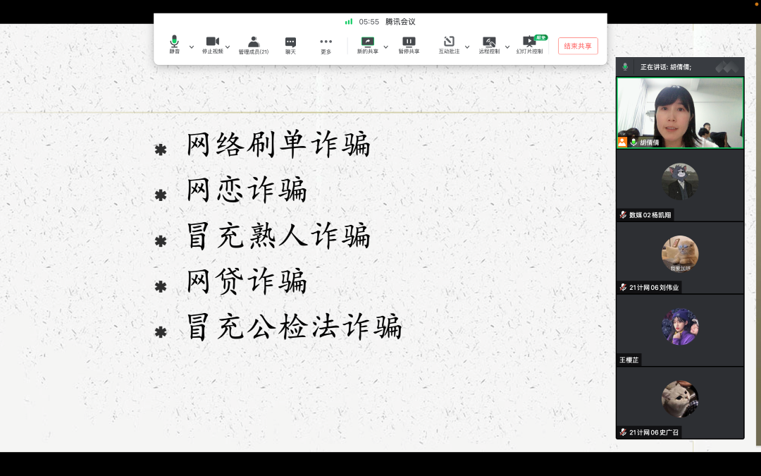本次活动全程以介绍大学生有可能遇到的骗局以及应采取的对应防骗手段为主要内容,并以叙述讨论的方式向同学们介绍各自的经验,提高同学们的防骗意识。诈骗不仅与我们的生活息息相关,而且它也屡次发生在同学们身上。因此,同学们对这次班会的内容非常认真。会后,同学们纷纷表示,这场班会使大家受益匪浅,今后在各种场合我们都应我们都应提高警惕,不要有“贪婪之心”、客服“恐惧之心”,放弃“好奇之心”、警惕“麻痹之心”,遇到陌生短信电话、中奖信息、QQ求助、汇款等事情一定小心谨慎,仔细甄别,千万不要轻信麻痹和上当上骗。实在不能确定真假及时110报警求助。