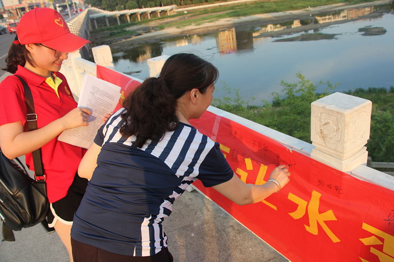 “红色筑梦团”针对不同主题分两队开展宣传教育活动。第一队志愿者在新县潢河大桥旁边对当地居民和过往游客行人分享预防未成年溺水的安全知识。他们用实际案例,分析了儿童溺水事故现状,给行人们介绍了游泳过程中应注意的问题、游泳中遇到紧急情况及溺水情况如何应对等,并劝阻未成年人勿去河流、水库、池塘等危险水域玩耍,尤其是不要随便或独自下沟渠池塘等地玩耍、捉鱼虾或捡拾东西,并向他们讲解了防溺水的重要性和必要性。志愿者还特别建议学生家长,遇到别人溺水,不盲目救人,平时注重提高孩子防溺水自觉性教育,培养孩子识别险情、紧急避险、遇险逃生能力;同时我们提醒未成年人家长切实做好孩童防溺水教育及监护工作。当地民众表示非常赞同这次主题教育,纷纷踊跃在“预防溺水,不要让水变成亲人的眼泪”红色条幅上签下自己的名字或留下祝福的话语,用实际行动践行自己的承诺。
