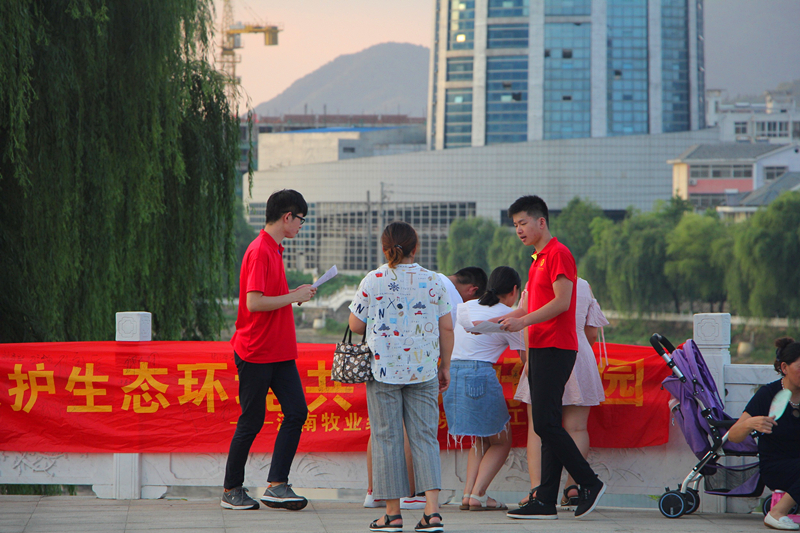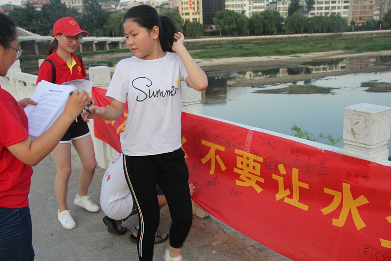另一队志愿者成员也积极开展保护生态环境宣传教育活动。在附近休闲玩耍的人们纷纷自发前来参加万人签名活动,上到70岁的老人,下至刚上小学的小朋友,都积极踊跃参与,大家用签名这种方式来表达自己保护生态环境的信心和决心。