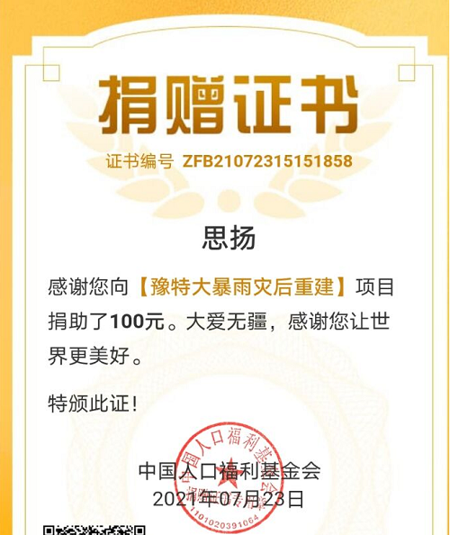 李思扬同学为我院20级软件专业7班班长,在日常生活和学习中尽心尽力为广大同学服务。听闻家乡省内遭受暴雨灾害后,在外省打暑假工的他遗憾自己不能到达灾区充当志愿者,但是他毫不犹豫为灾后重建捐款,并且在朋友圈中多次通知和转发应急救援信息等。