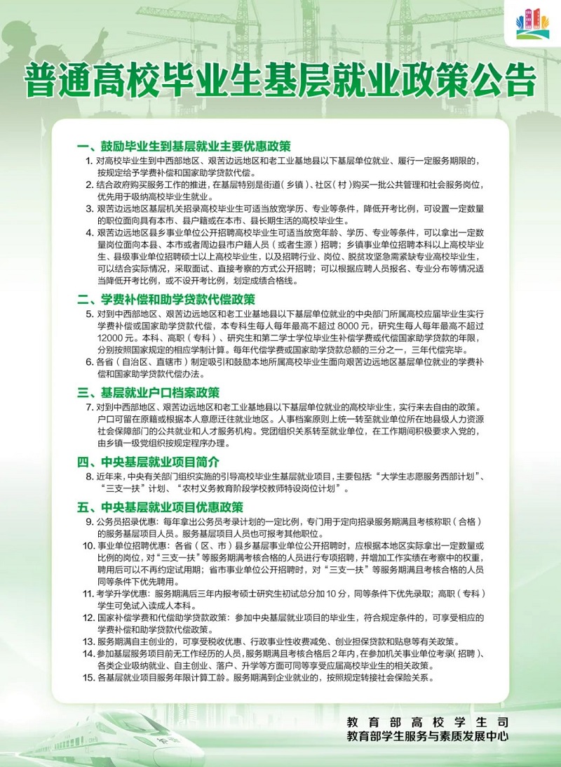 12. 国家补偿学费和代偿助学贷款政策:参加中央基层就业项目的毕业生,符合规定条件的,可享受相应的学费补偿和助学贷款代偿政策。