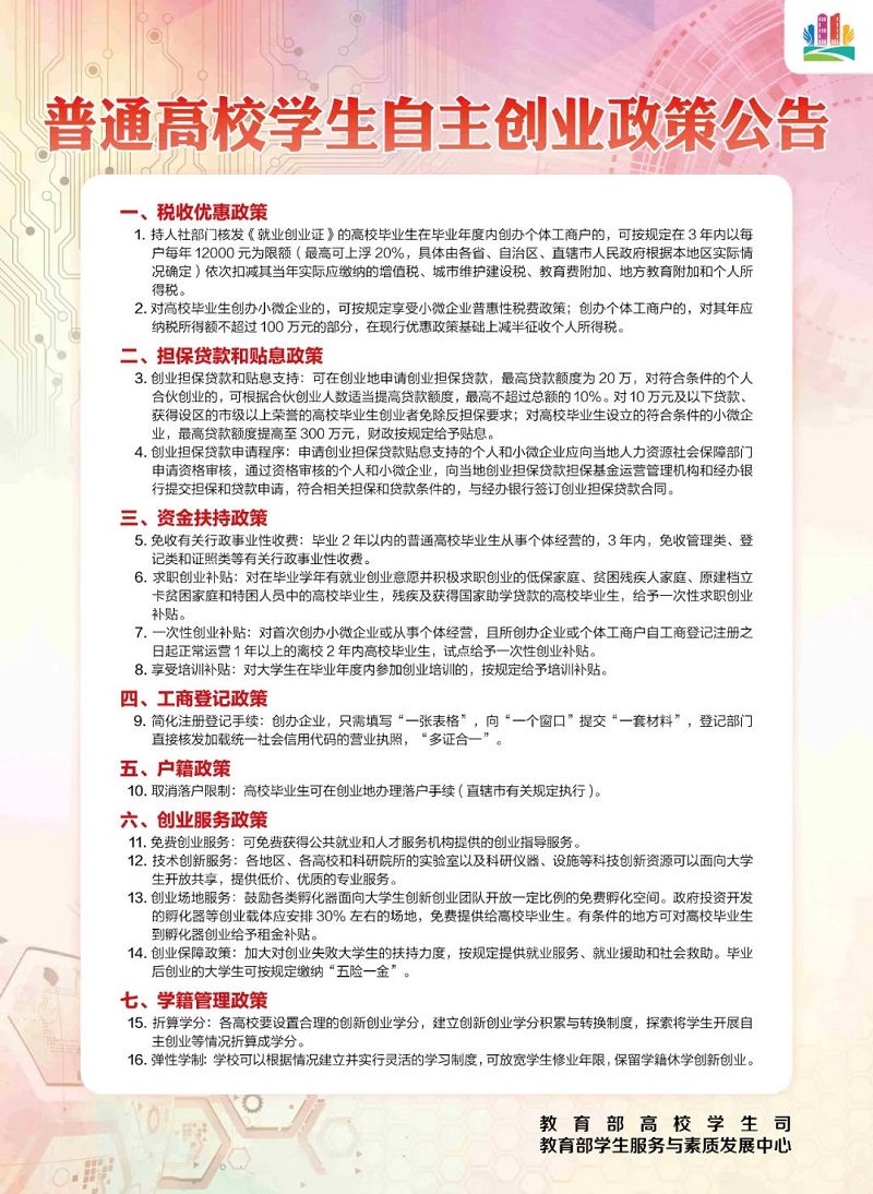 普通高校学生自主创业政策公告